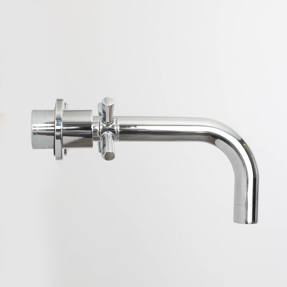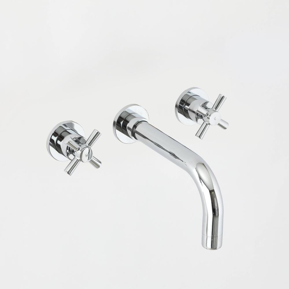Un moderno kit con rubinetteria murale a 3 fori per lavabo realizzato in ottone cromato progettato per creare un look minimal nella stanza da bagno.