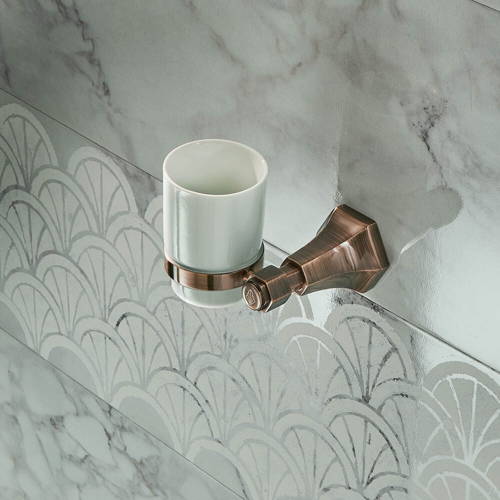 Realizzato in ceramica, il portaspazzolino presenta un design montato a parete, creando uno spazio pulito e ordinato attorno al lavandino del tuo bagno. Il supporto è stato realizzato in ottone e presenta un design ispirato all'Art Déco per un tocco elegante.