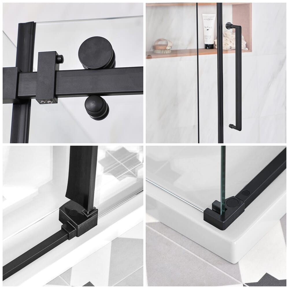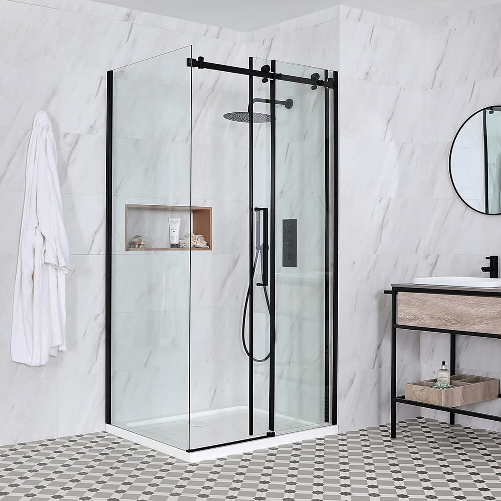 Box Doccia Angolare Nero con Porta Scorrevole Senza Telaio e Piatto Doccia - Scelta di Dimensioni - Nox