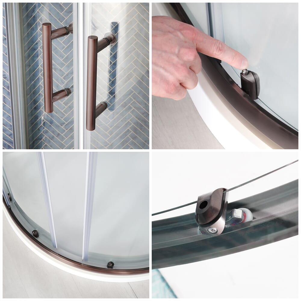 Progettato per resistere ai rigori dell'uso quotidiano, questo robusto box doccia presenta una forma semicircolare salvaspazio e una finitura in Rame Spazzolato per un look sorprendente. Utilizza un vetro temperato da 6mm per una resistenza e una durata eccezionali e ha doppi rulli per un'apertura regolare, mentre la guarnizione magnetica significa fa sì che le porte rimangono chiuse e a tenuta stagna.