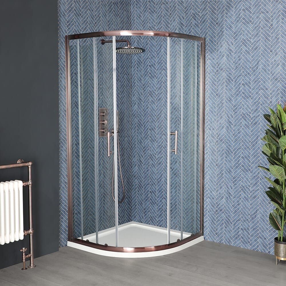 Crea uno spazio doccia che si distingua dalla massa e crea un look contemporaneo con il box doccia semicircolare Eris in rame da 900mm.