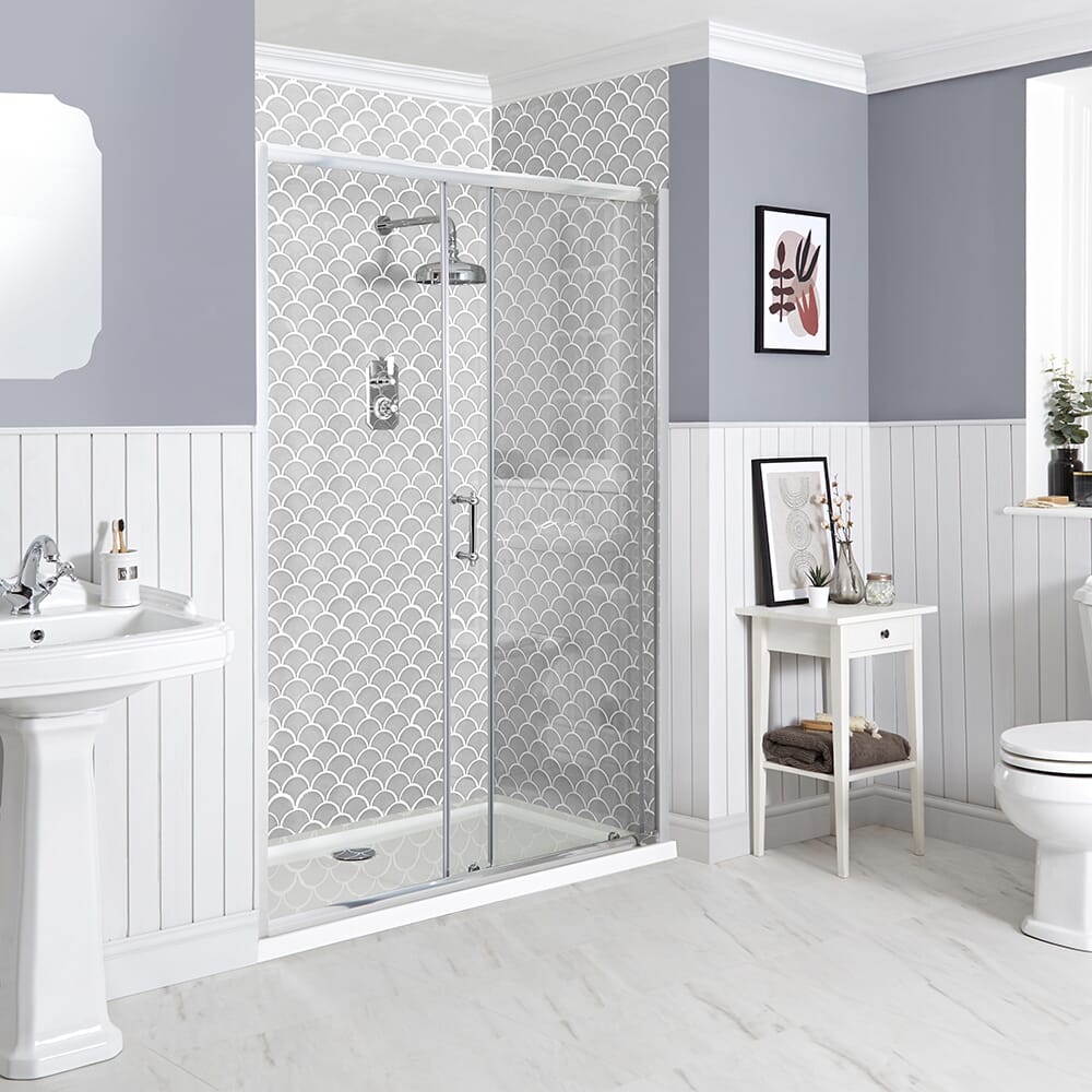 Arricchisci il tuo bagno in stile vintage con il box doccia tradizionale ad incasso con porta scorrevole Langley, completa di piatto doccia e piletta a scarico rapido.