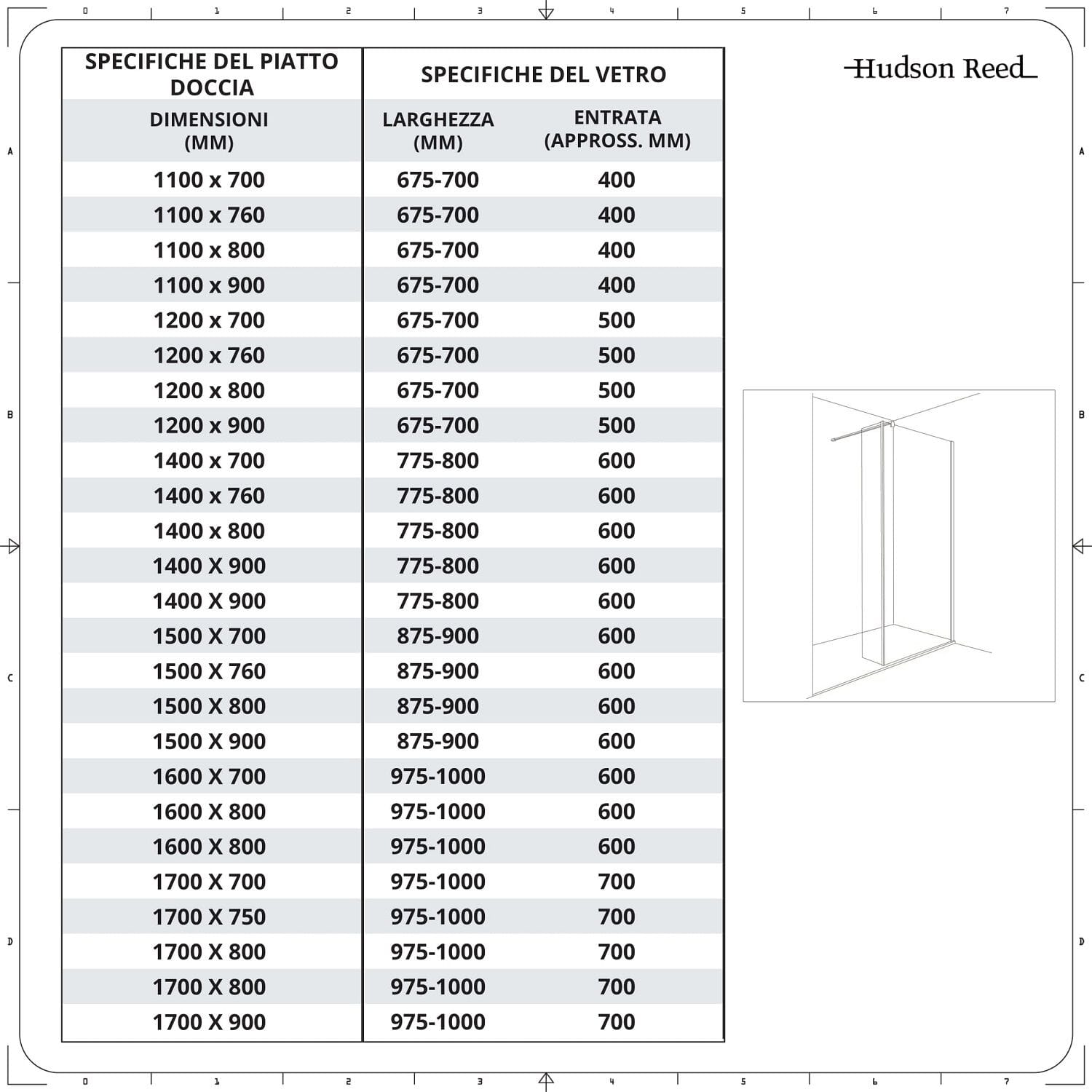 - Dimensioni del piatto doccia: da 1100 x 700mm a 1700 x 900mm