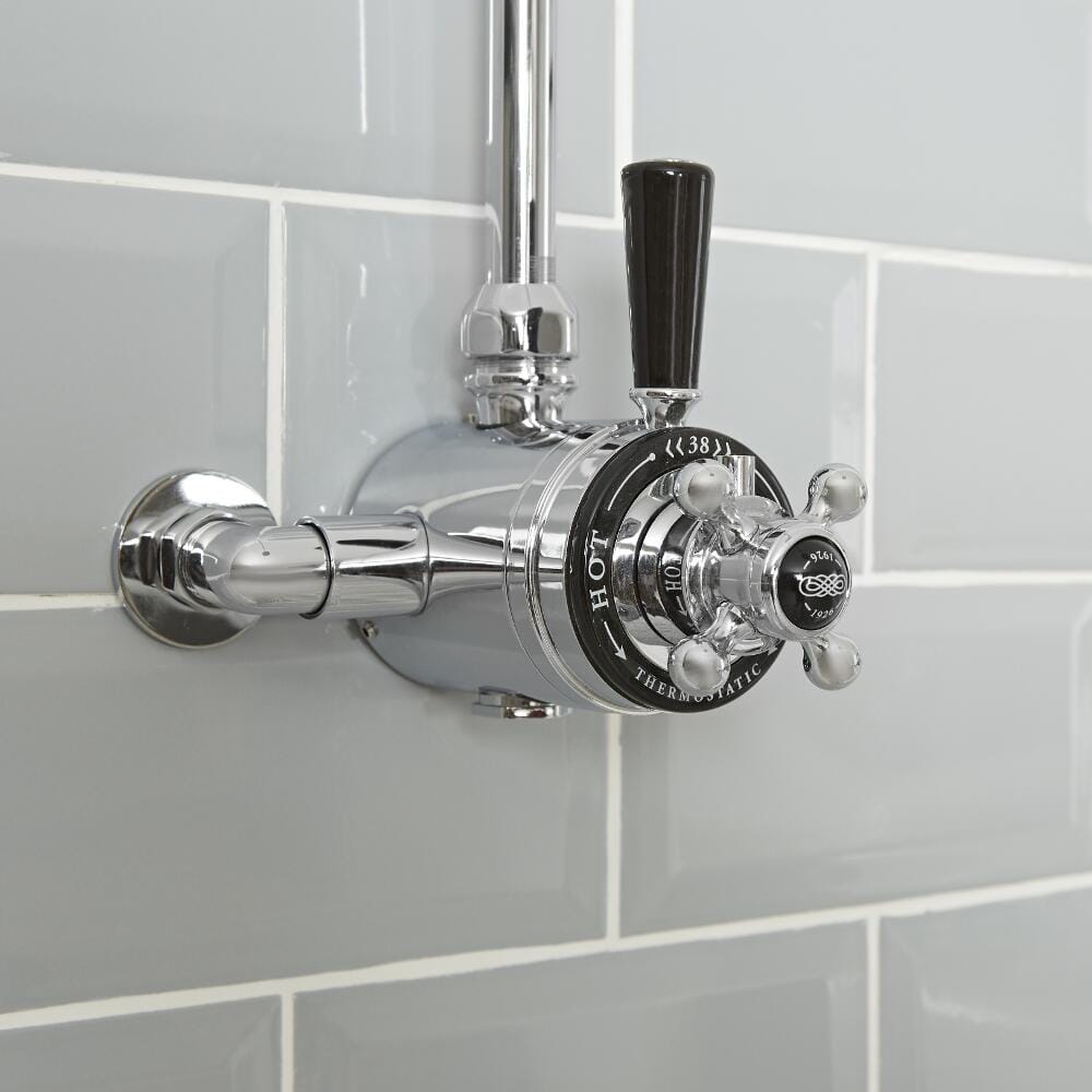 Ottieni uno splendido look vintage e goditi una lussuosa esperienza di doccia con la colonna doccia tradizionale Elizabeth e il miscelatore termostatico con una brillante finitura cromata e dettagli in ceramica nera.