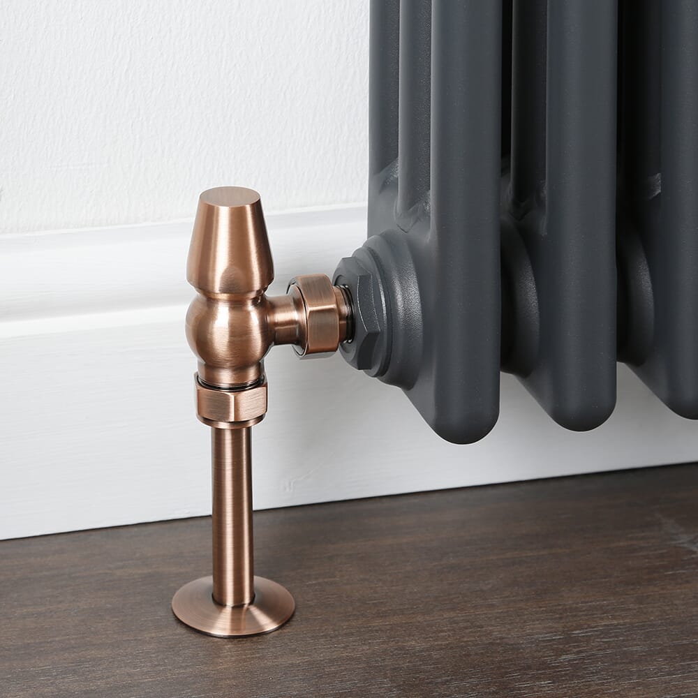 Crea un look senza tempo ed elegante con le tradizionali valvole termostatiche ad angolo in rame antico Regent.