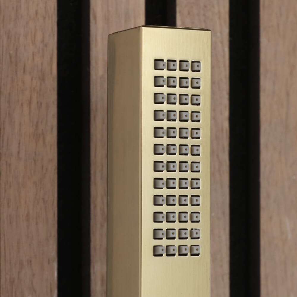 Aggiungi un tocco moderno ma elegante al tuo bagno con la doccetta Lyra in oro satinato, completa di supporto a parete integrato e gomito di uscita.