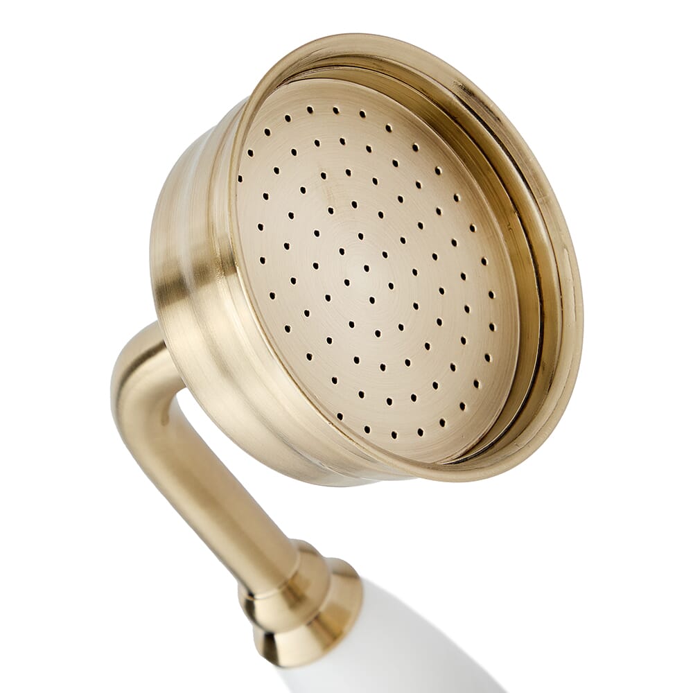 Arricchisci il tuo bagno tradizionale e aggiungi un tocco di opulenza con la doccetta in oro satinato Elizabeth, completa di supporto a parete e raccordo a gomito integrato.