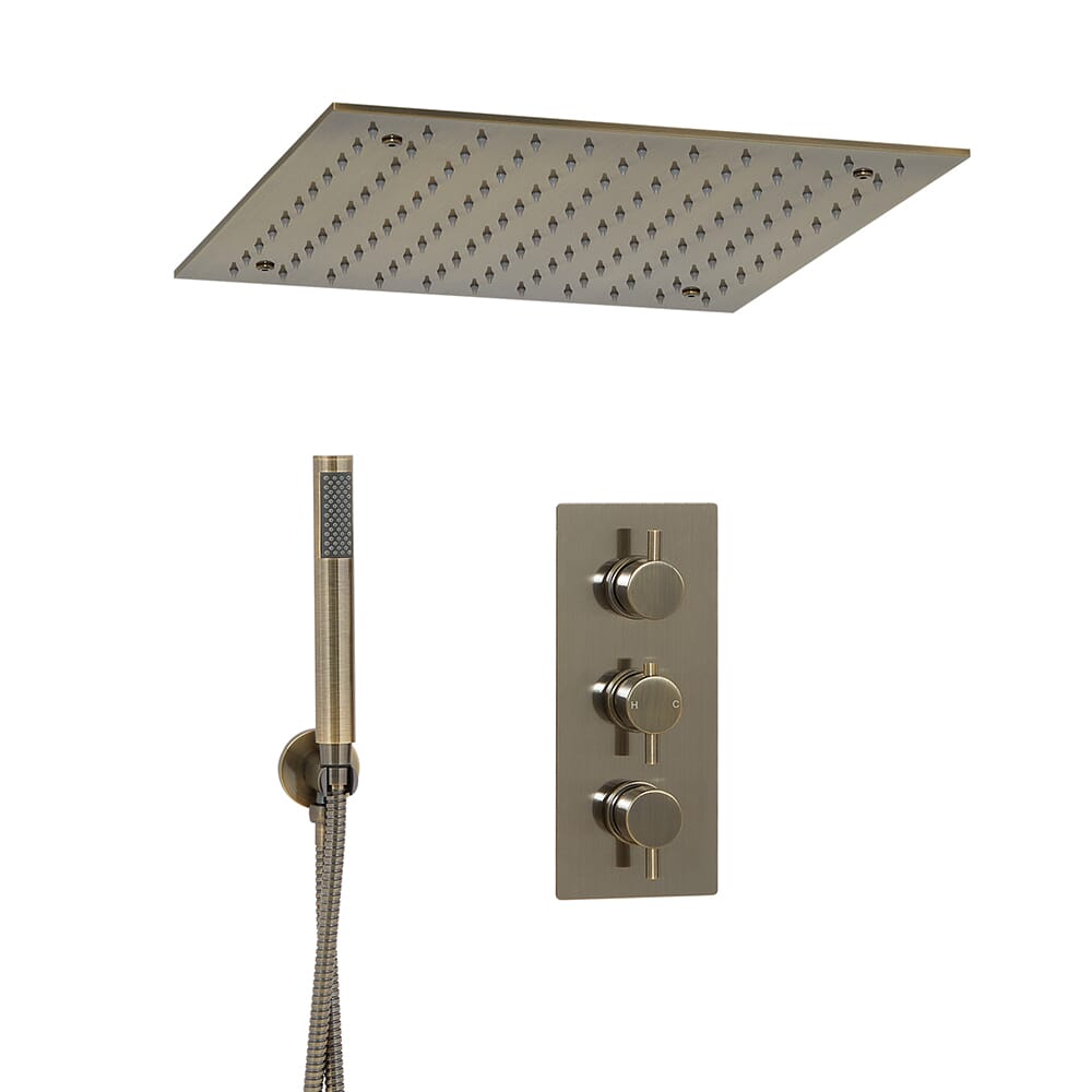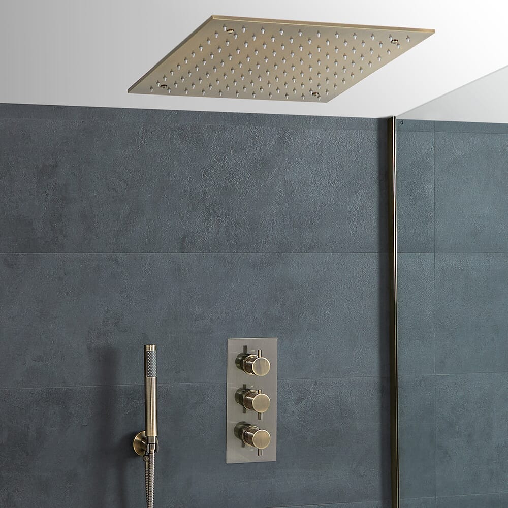 Crea un look unico e contemporaneo con la doccia termostatica in ottone spazzolato Clarus, completa di miscelatore doccia, soffione doccia da incasso da 400mm e doccetta.