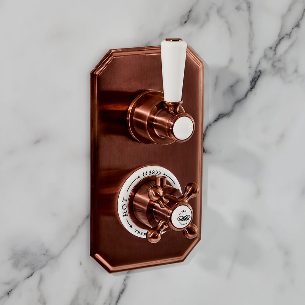 Crea un look davvero elegante e senza tempo con la splendida doccia termostatica Elizabeth in rame satinato, completa di doppio deviatore, soffione a parete da 205 mm e kit doccetta.