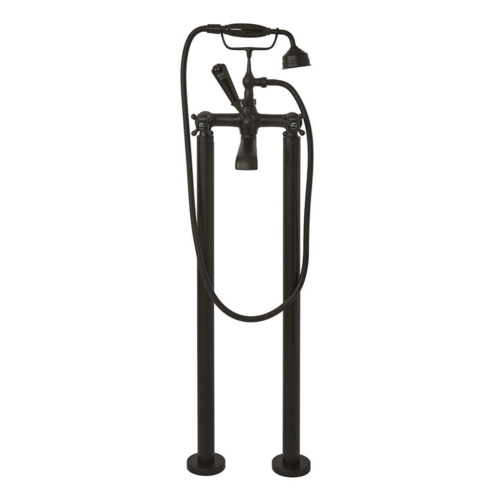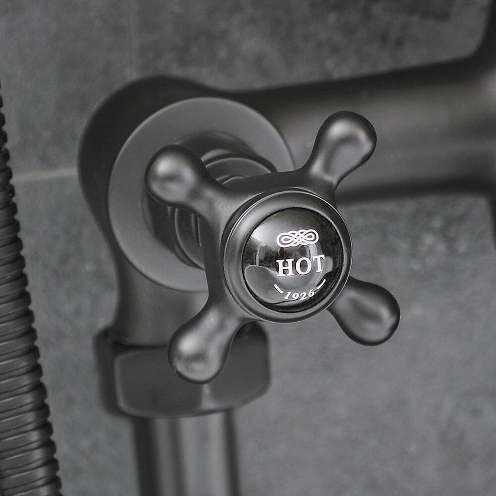 Questo miscelatore per vasca da bagno realizzato splendidamente, presenta una resistente finitura nera opaca e un design elegante, creando un look audace, sofisticato e senza tempo. Perfetto per migliorare ulteriormente il tuo bagno in stile vintage, questo miscelatore per vasca da bagno freestanding è stato realizzato in ottone massiccio per una durata garantita. Ha maniglie a croce con indici in ceramica, che forniscono un controllo agevole e senza sforzo; mentre la leva in ceramica devia il flusso d'acqua verso la doccetta o l’erogatore della vasca.
