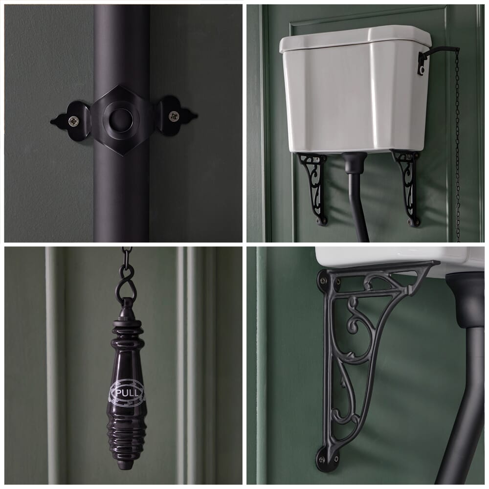 Creato appositamente per l'uso con una cassetta di scarico altra tradizionale, questo kit di scarico presenta un design senza tempo e una finitura nera opaca per un look audace ma elegante. Il kit è stato realizzato in ottone e include una maniglia in ceramica, garantendo una lunga durata nel tempo.