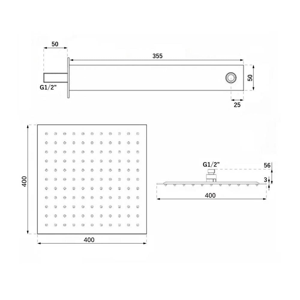 - Soffione quadrato 400 mm con braccio a parete in ottone