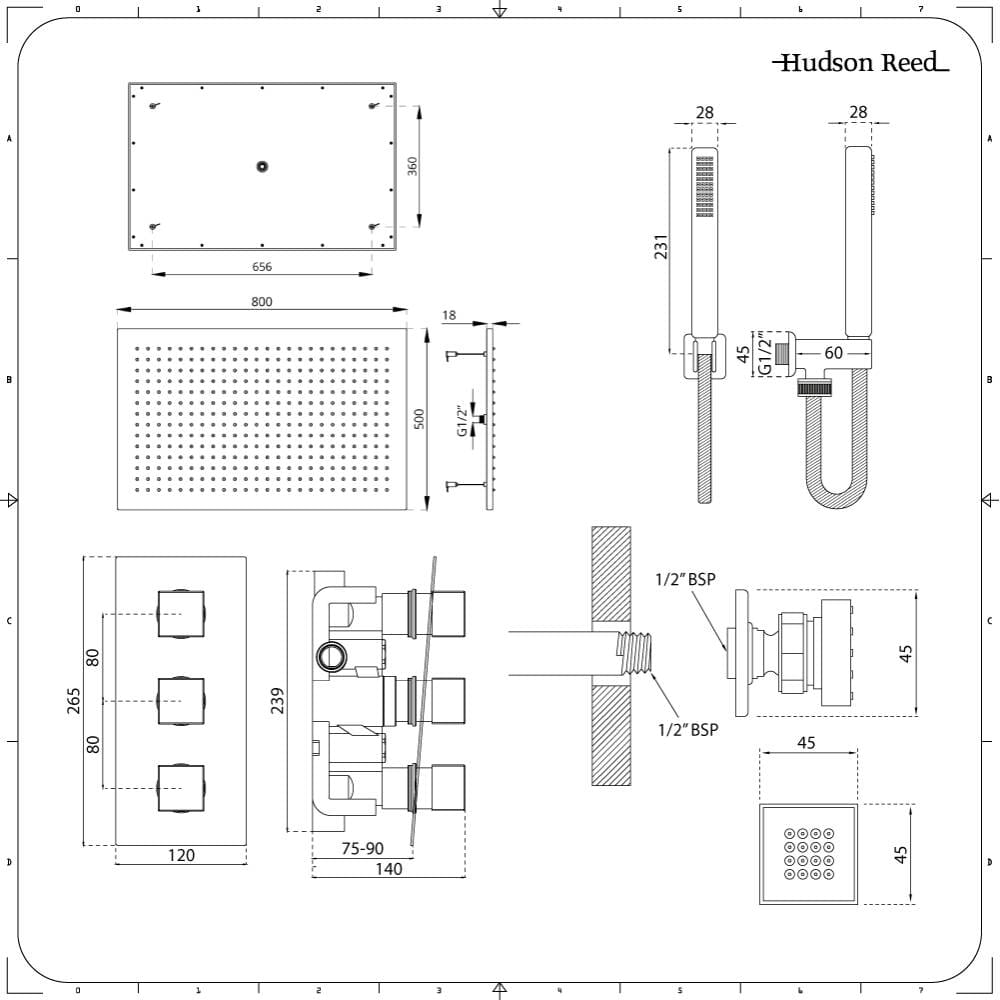 Goditi un'esperienza rilassante simile a una spa con la doccia termostatica Kubix, completa di miscelatore triplo, soffione 800 mm x 500 mm, doccetta e quattro getti corpo.