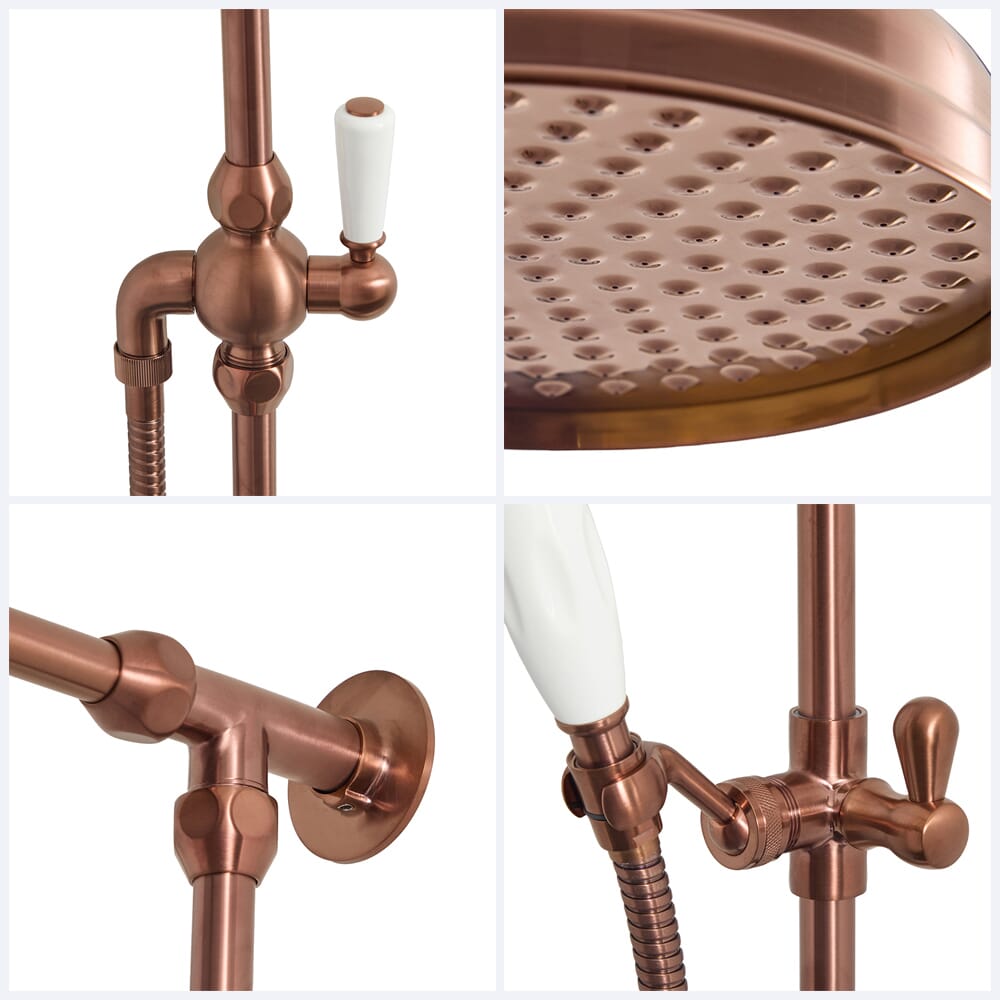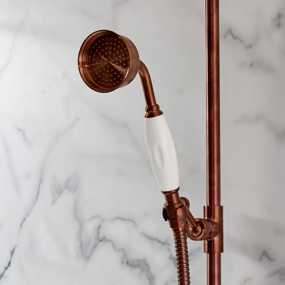 Crea uno straordinario look tradizionale con il kit doccia Elizabeth in rame satinato, completo di soffione rotondo e doccetta con flessibile.