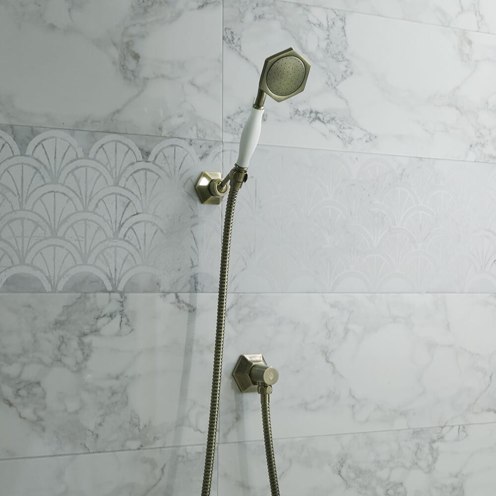 Aggiungi un tocco di glamour in stile Art Déco al tuo bagno con il kit doccia della gamma Earlham.