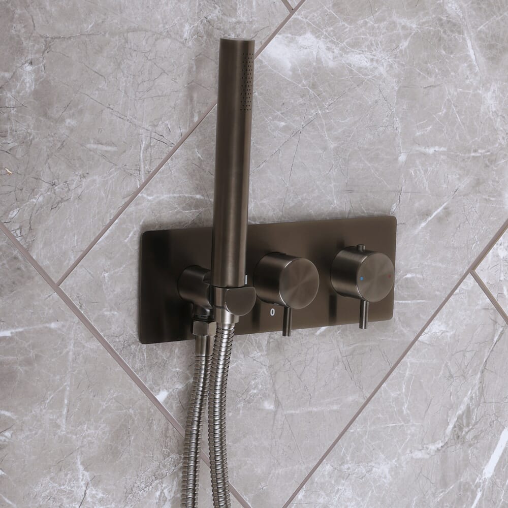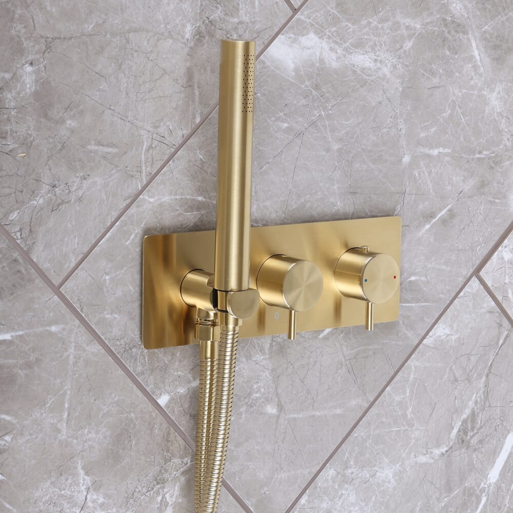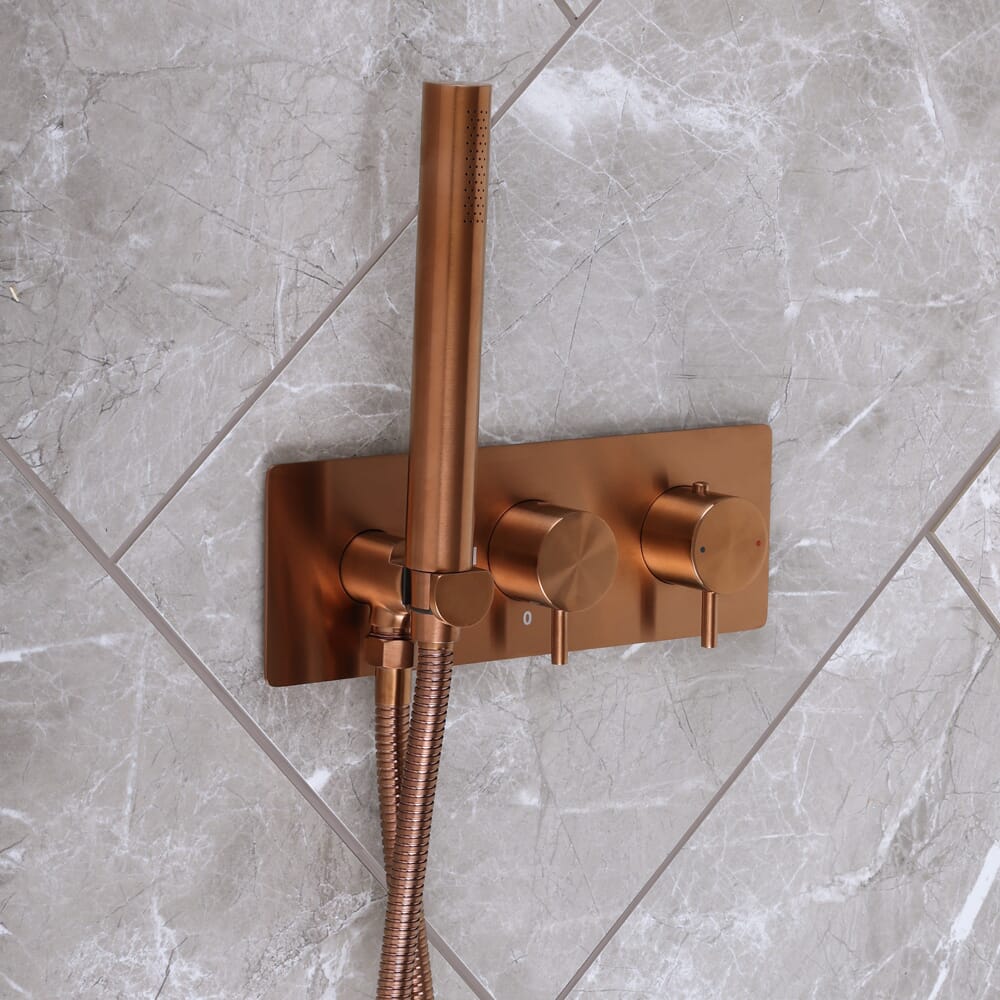 Con una struttura in ottone massiccio per una sensazione di lusso e una durata garantita, il miscelatore con deviatore per doccia è dotato di maniglie rotonde facili da usare e utilizza la tecnologia antiscottatura per una doccia sicura e confortevole ogni volta.
