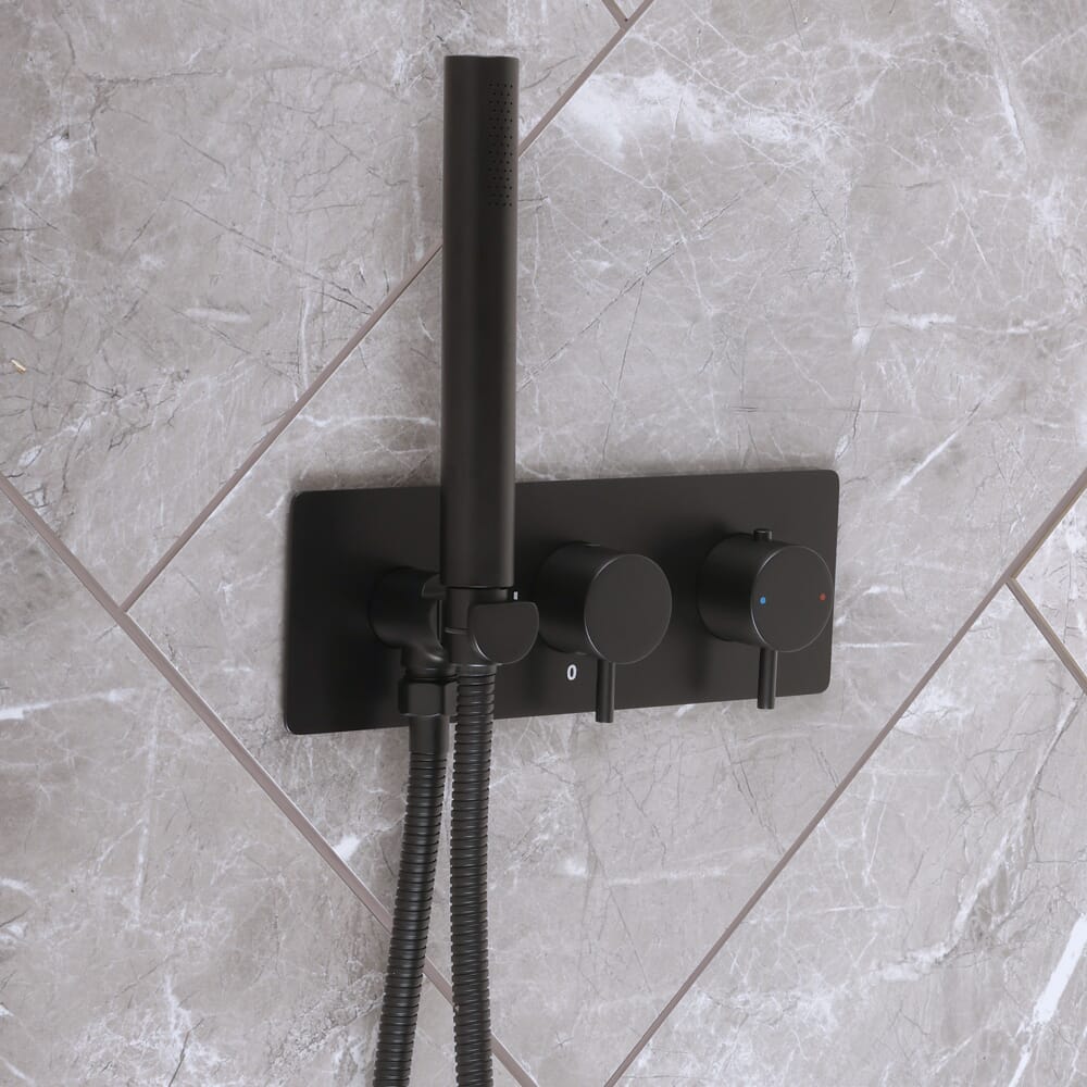 Il miscelatore termostatico per doccia a doppio deviatore della gamma Otto, completo di doccetta e flessibile, conferisce al tuo bagno un look minimal e contemporaneo.