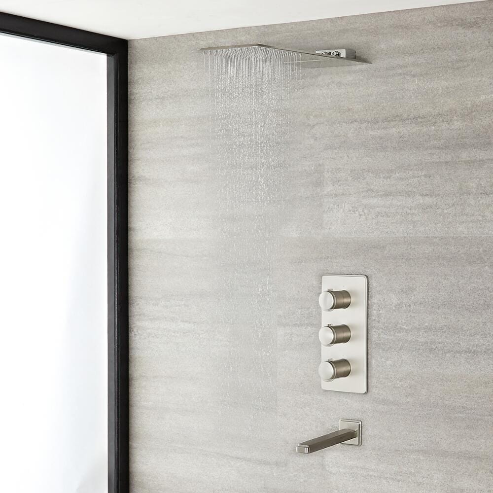 Kit Doccia in Nichel Spazzolato Completo di Miscelatore Doccia Termostatico a 3 Vie con Deviatore, Soffione doccia a 2 Vie ed Erogatore per Vasca in Nichel Spazzolato - Aldwick