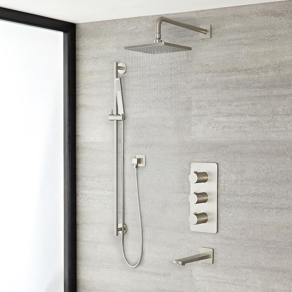Aggiungi un tocco di classe alla tua stanza da bagno con questo fantastico kit doccia completo di miscelatore termostatico triplo a tre vie, erogatore per vasca e soffione doccia quadrato 200x200mm ed erogatore per vasca. Caratterizzato da un’elegante finitura in nichel spazzolato, abbina perfettamente con qualsiasi stanza da bagno moderna. Il miscelatore doccia termostatico viene fornito con una cartuccia termostatica con protezione anti scottature nel caso d’interruzione d'erogazione dell'acqua fredda, blocca completamente l'erogazione dell'acqua calda e la valvola si ferma.