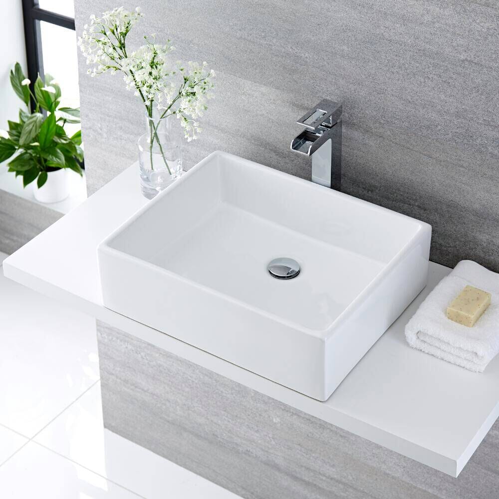 Lavabo Bagno da Appoggio Quadrato in Ceramica 490x390mm con Rubinetto Monoforo - Haldon