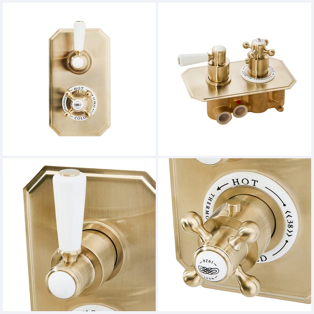Fornendo un controllo senza sforzo a due vie doccia in modo indipendente, come una doccetta e un soffione a pioggia, questo miscelatore doccia utilizza la tecnologia antiscottatura, garantendo ogni volta una doccia sicura e confortevole. Realizzata in ottone massiccio per un'eccellente resistenza e durata, il miscelatore per doccia Elizabeth presenta accenti in ceramica bianca e una finitura in oro satinato per un tocco opulento.