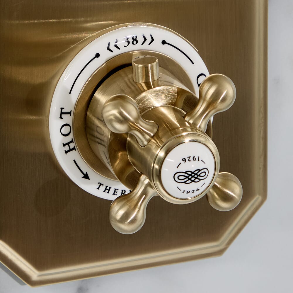 Crea uno straordinario look vintage con il miscelatore doppio termostatico da incasso con deviatorein oro satinato Elizabeth.