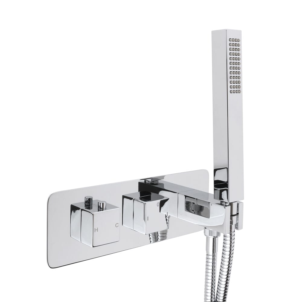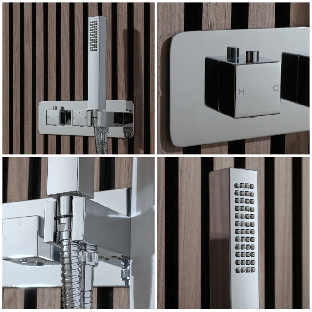 Realizzato in ottone cromato, questo miscelatore doccia termostatico con deviatore integrato si caratterizza per l’elegante design quadrato con finitura cromata di alta qualità e un moderno design. Viene fornito con un flessibile doccia 175cm e una doccetta con ugelli di silicona che consentono di pulire la doccetta e prevenire l'accumulo di calcare.