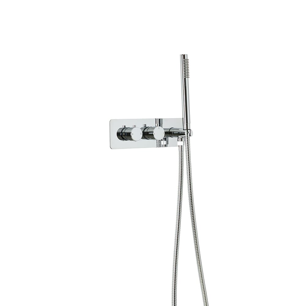 Realizzato in ottone cromato, questo miscelatore doccia termostatico con deviatore integrato e manopole tonde si caratterizza per l’elegante design quadrato con finitura cromata di alta qualità e un moderno design. Viene fornito con un flessibile doccia 175cm e una doccetta con ugelli di silicona che consentono di pulire la doccetta e prevenire l'accumulo di calcare.