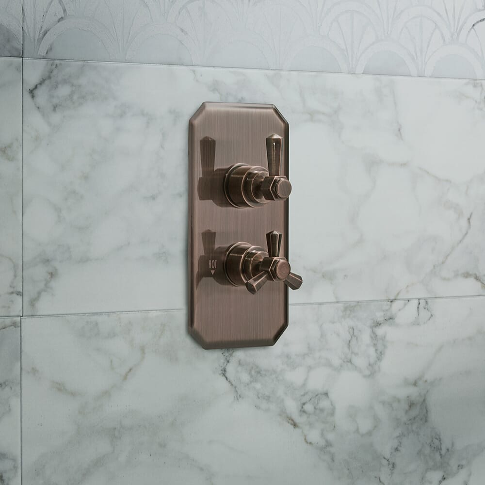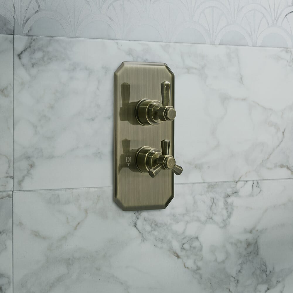Aggiungi un tocco di glamour tradizionale al tuo bagno con il miscelatore termostatico doppio per doccia della gamma Earlham.