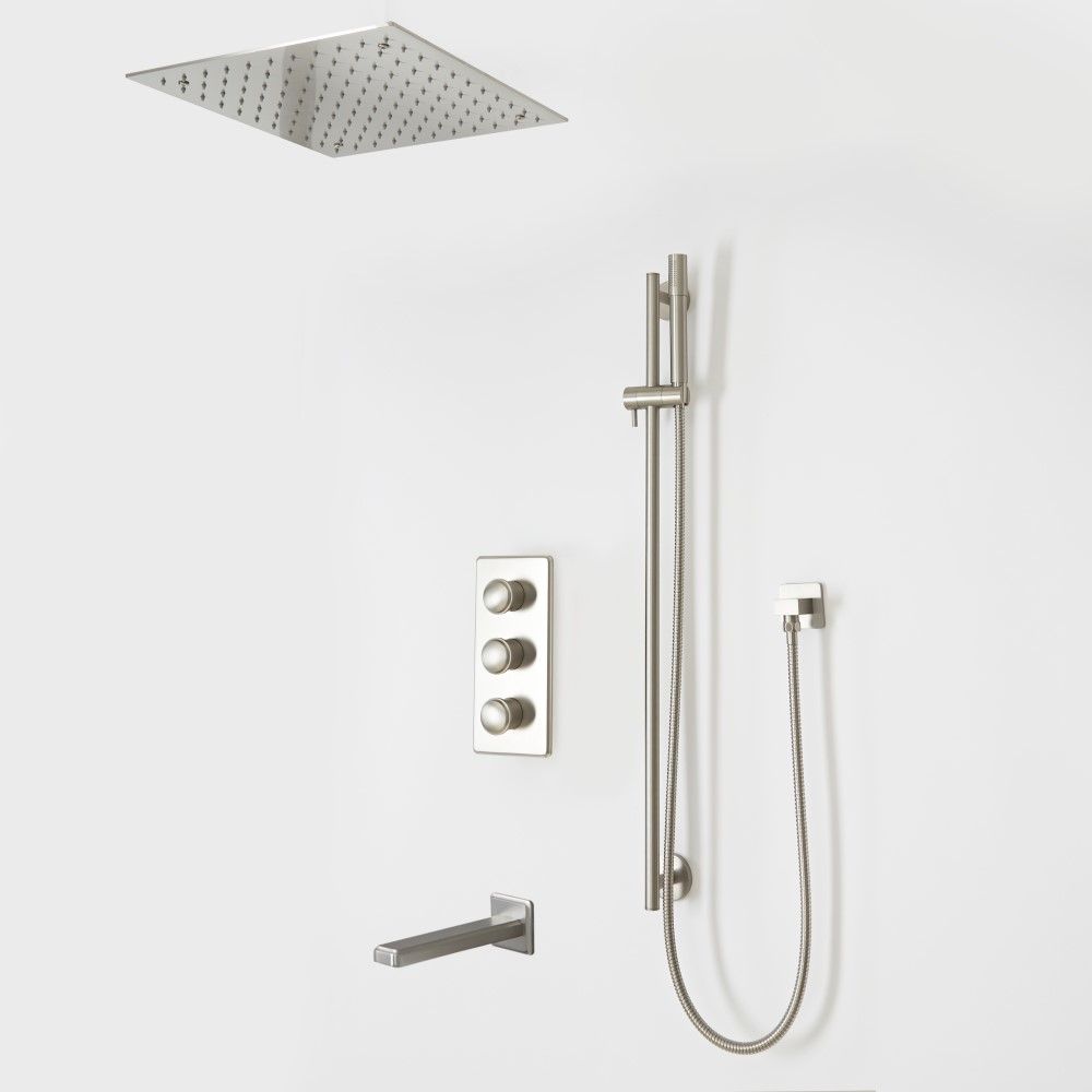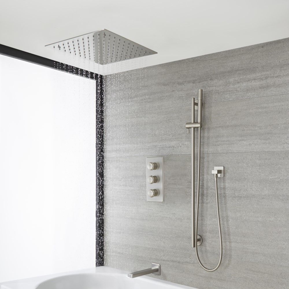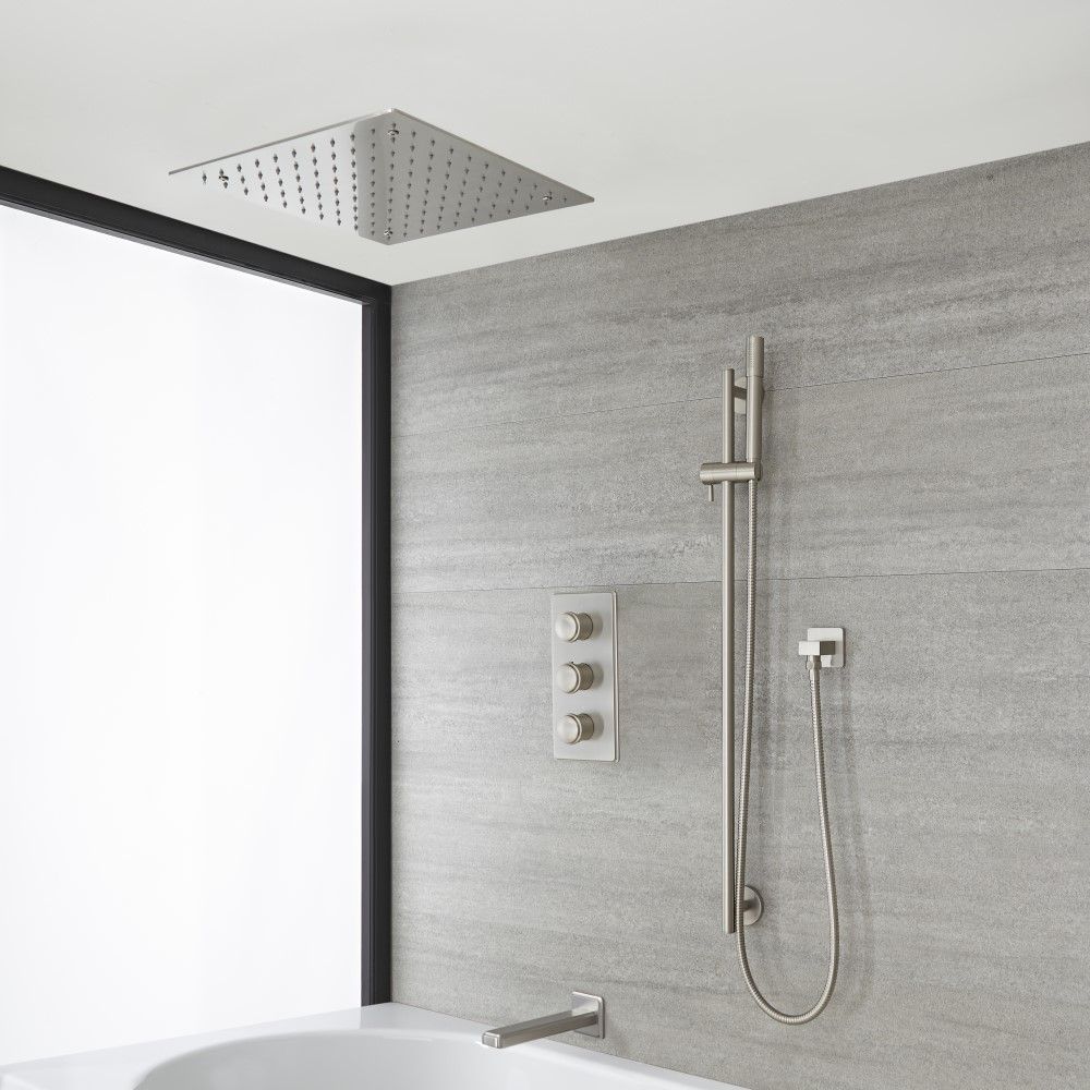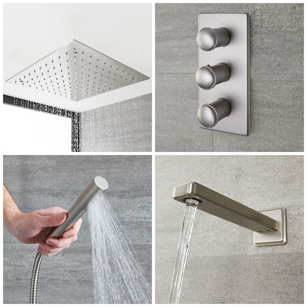 Porta uno stile di design nel tuo bagno con la doccia termostatica in nichel spazzolato Aldwick, completa di deviatore doccia, soffione da incasso da 400mm, asta saliscendi con doccetta ed erogatore vasca a parete.