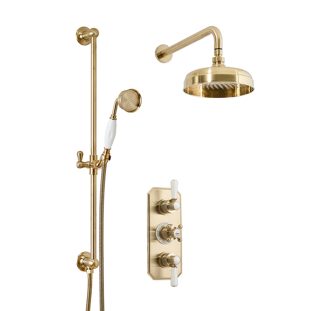 Porta uno straordinario stile tradizionale nel tuo bagno con la doccia termostatica Elizabeth, completa di miscelatore triplo, soffione da 205 mm ed asta saliscendi.