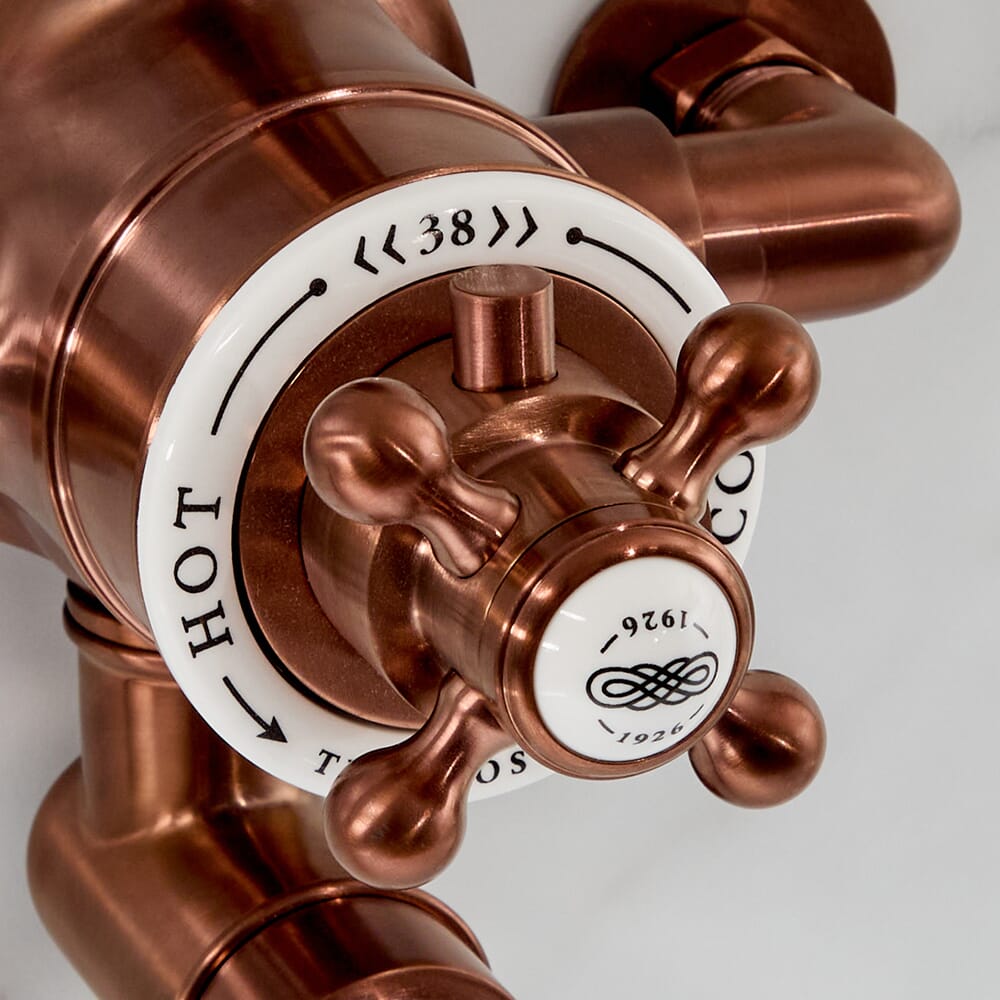 Specificamente progettato per l'uso con asta saliscendi Elizabeth, questo miscelatore termostatico esposto presenta un'elegante finitura rame satinato e un design senza tempo, donando un look vintage.