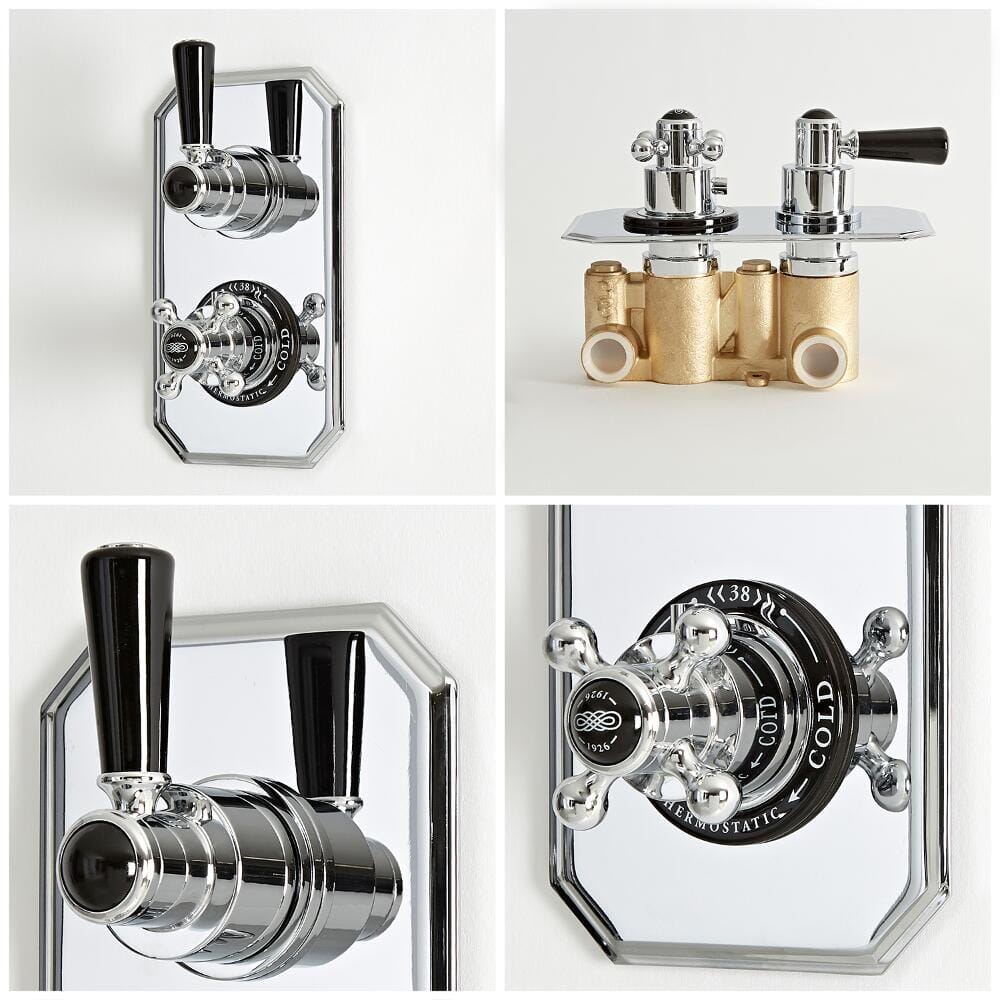 Caratterizzato da una resistente finitura cromata e dettagli in ceramica, il miscelatore termostatico è realizzato in ottone massiccio per una lunga durata ed incorpora il sistema antiscottatura con una temperatura massima preimpostata e una sicurezza di doccia garantita.