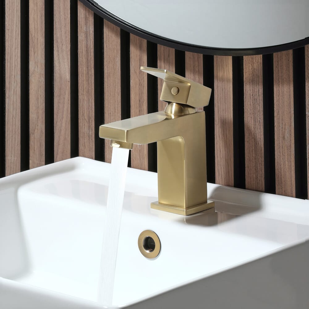 Questo miscelatore per lavabo presenta una finitura oro satinato per un tocco di lusso ed eleganti linee squadrate per un tocco di design. Realizzato in ottone per una durata garantita, il rubinetto per lavabo è dotato di una maniglia a leva singola per un facile controllo del flusso e della temperatura dell'acqua.