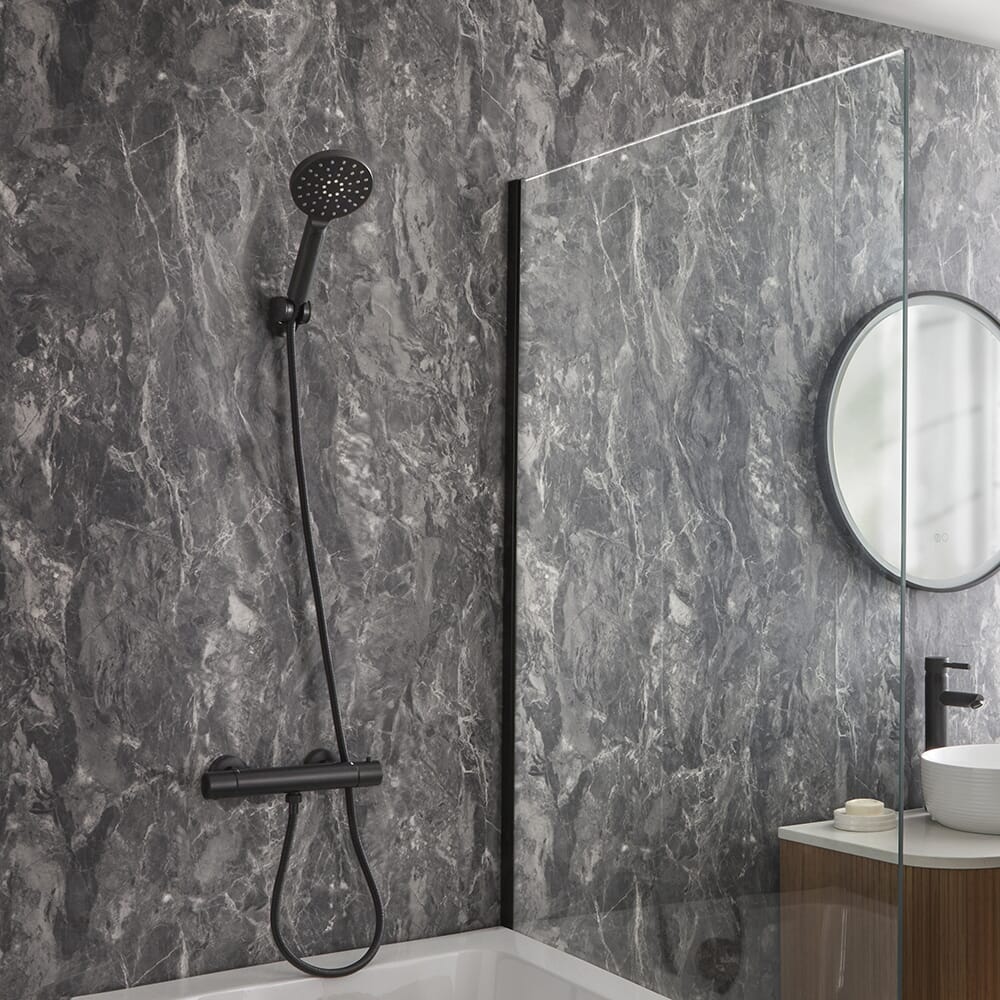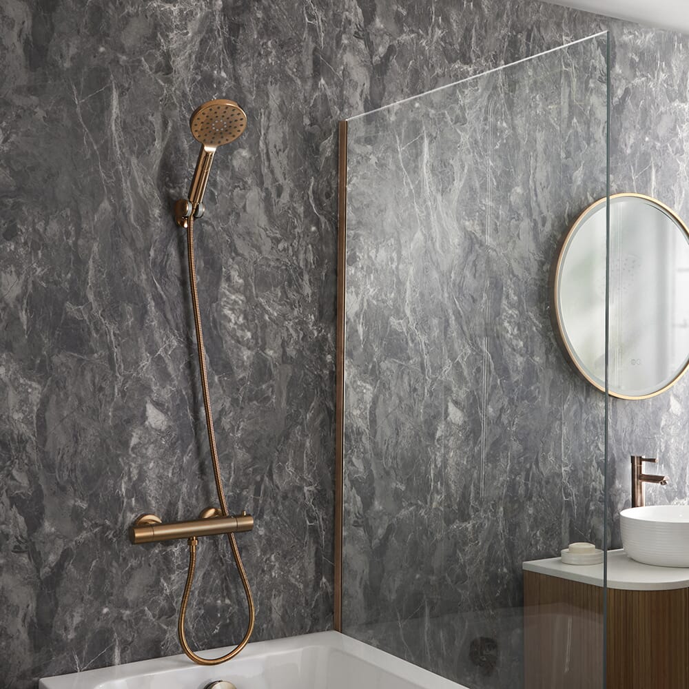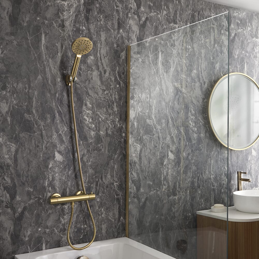 Rinnova il tuo bagno e dona un look moderno con il miscelatore a barra termostatico Elsie e il kit con doccetta.