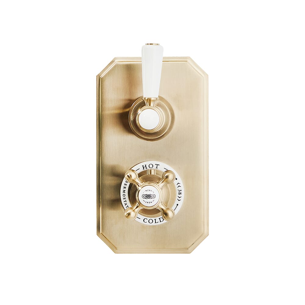 Progettato per fornire acqua a un'unica uscita della doccia, come una doccetta, questo splendidamente realizzato il miscelatore doccia utilizza il controllo termostatico della temperatura per evitare sbalzi di temperatura improvvisi per una doccia sicura e confortevole ogni volta. Presenta una splendida finitura in oro satinato e maniglie a leva e a croce facili da usare.