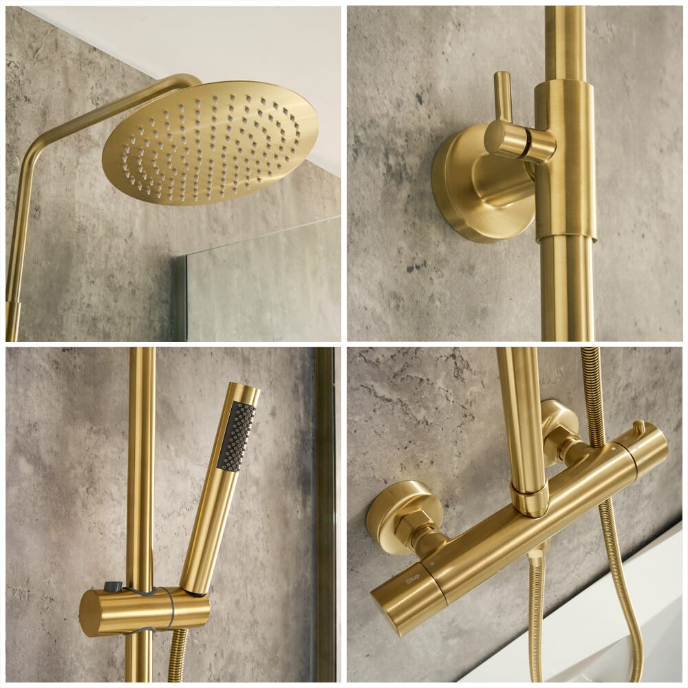 Rinnova il tuo bagno e aggiungi un tocco di opulenza con il moderno kit doccia termostatico Ayanna in oro satinato, completo di miscelatore a barra, soffione tondo e doccetta.