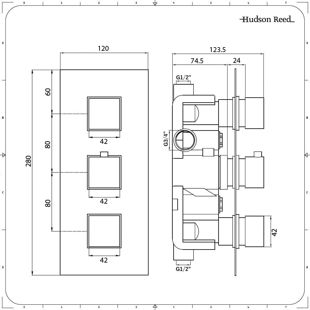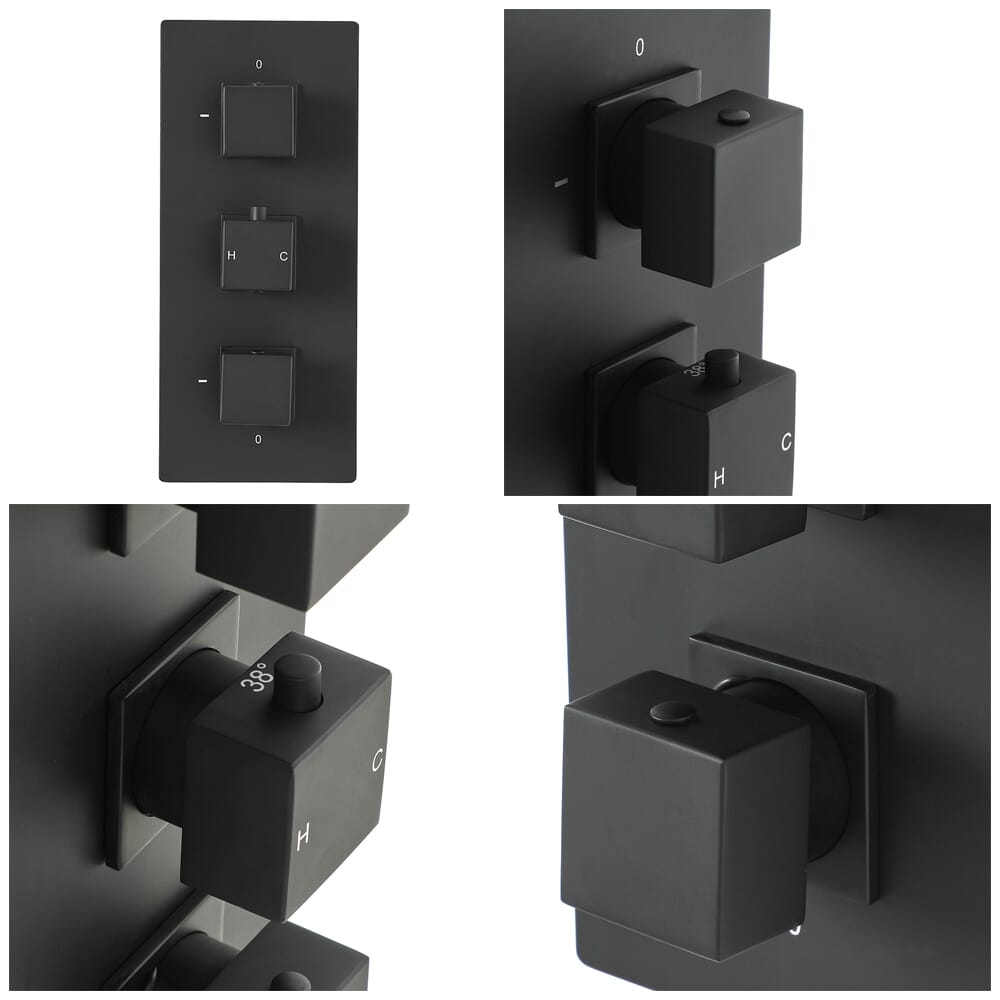 Realizzato in ottone massiccio per un'eccellente resistenza e durata, questo miscelatore termostatico per doccia incorpora la tecnologia antiscottatura per la massima tranquillità. Offrendo un controllo senza sforzo, è dotato di un nero opaco resistente e di eleganti maniglie quadrate per un look contemporaneo.