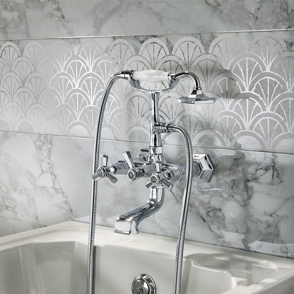 Con un design ispirato all'Art Déco, il miscelatore per vasca doccia a parete della gamma Earlham, completo di doccetta, porterà un fascino tradizionale nel tuo bagno.
