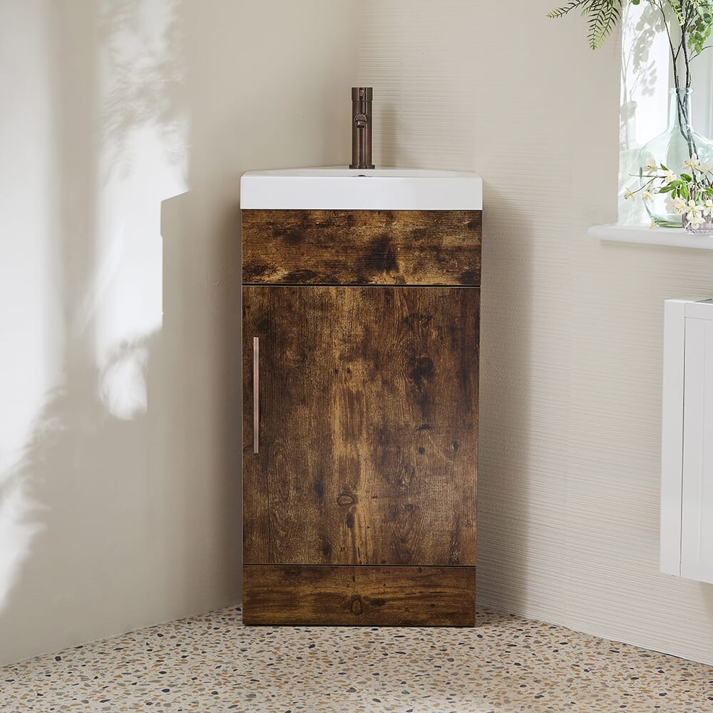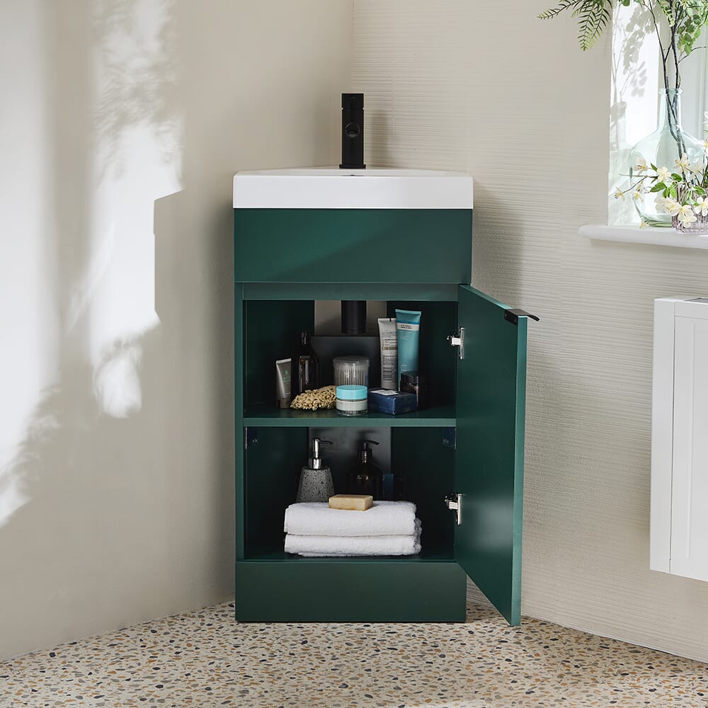 Il mobile angolare Cluo offre una soluzione elegante e pratica per un bagno di piccole dimensioni.