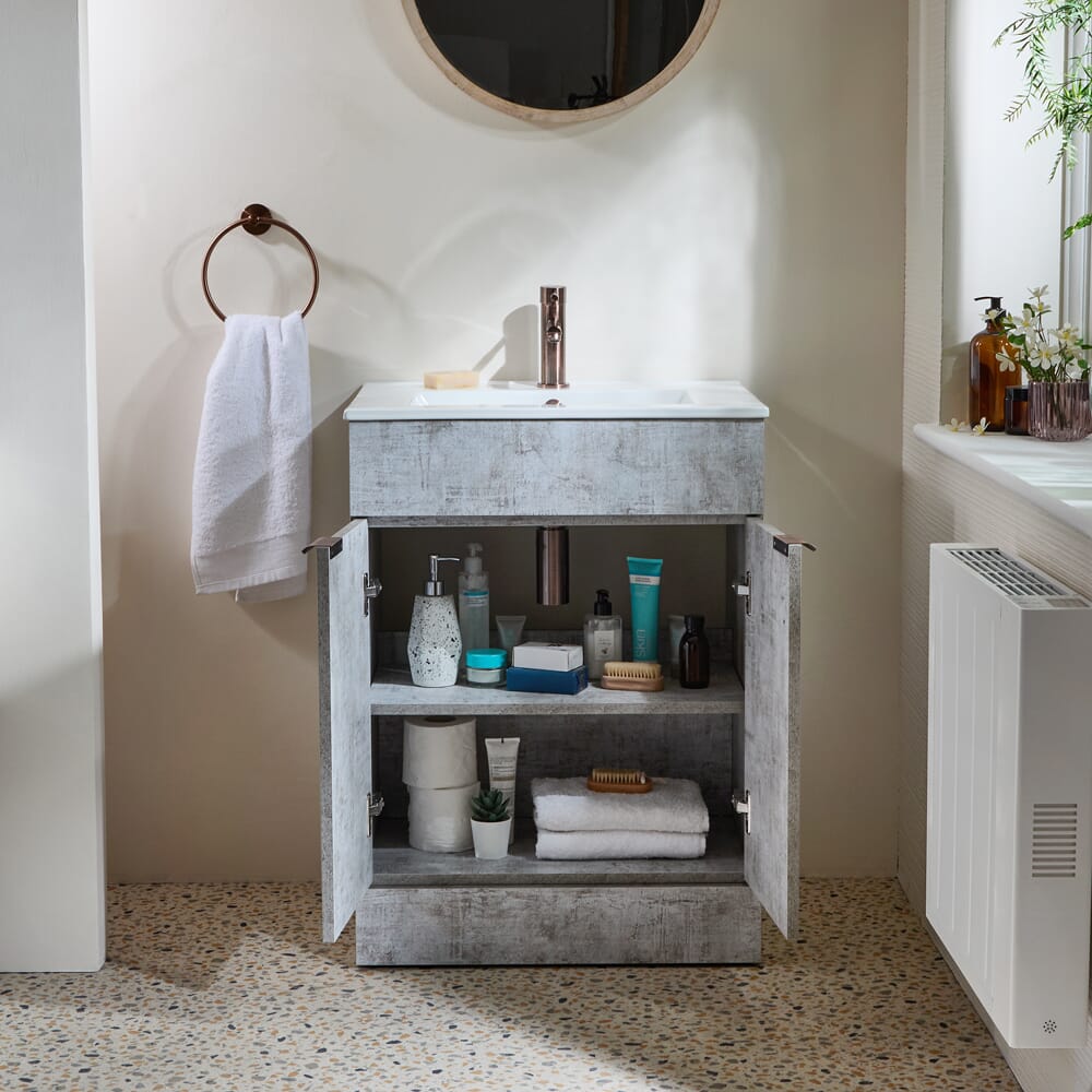 Caratterizzato da un design moderno, questo mobile offre un ampio spazio per riporre gli oggetti essenziali del bagno. Utilizza inoltre cerniere a chiusura ammortizzata per evitare che le ante sbattano e contribuire a ridurre l'usura.