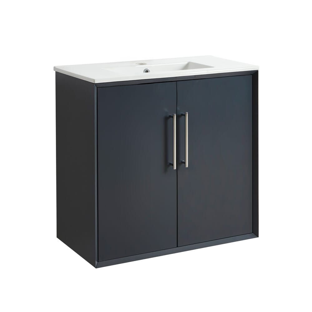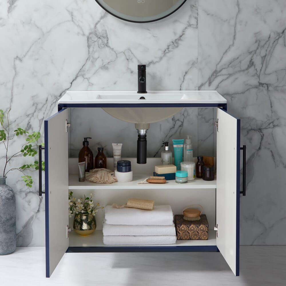 Questo mobile lavabo offre un ampio spazio per riporre gli oggetti essenziali del bagno. Ha un design a parete per massimizzare lo spazio a terra e ante con chiusura ammortizzata per ridurre al minimo il rumore.