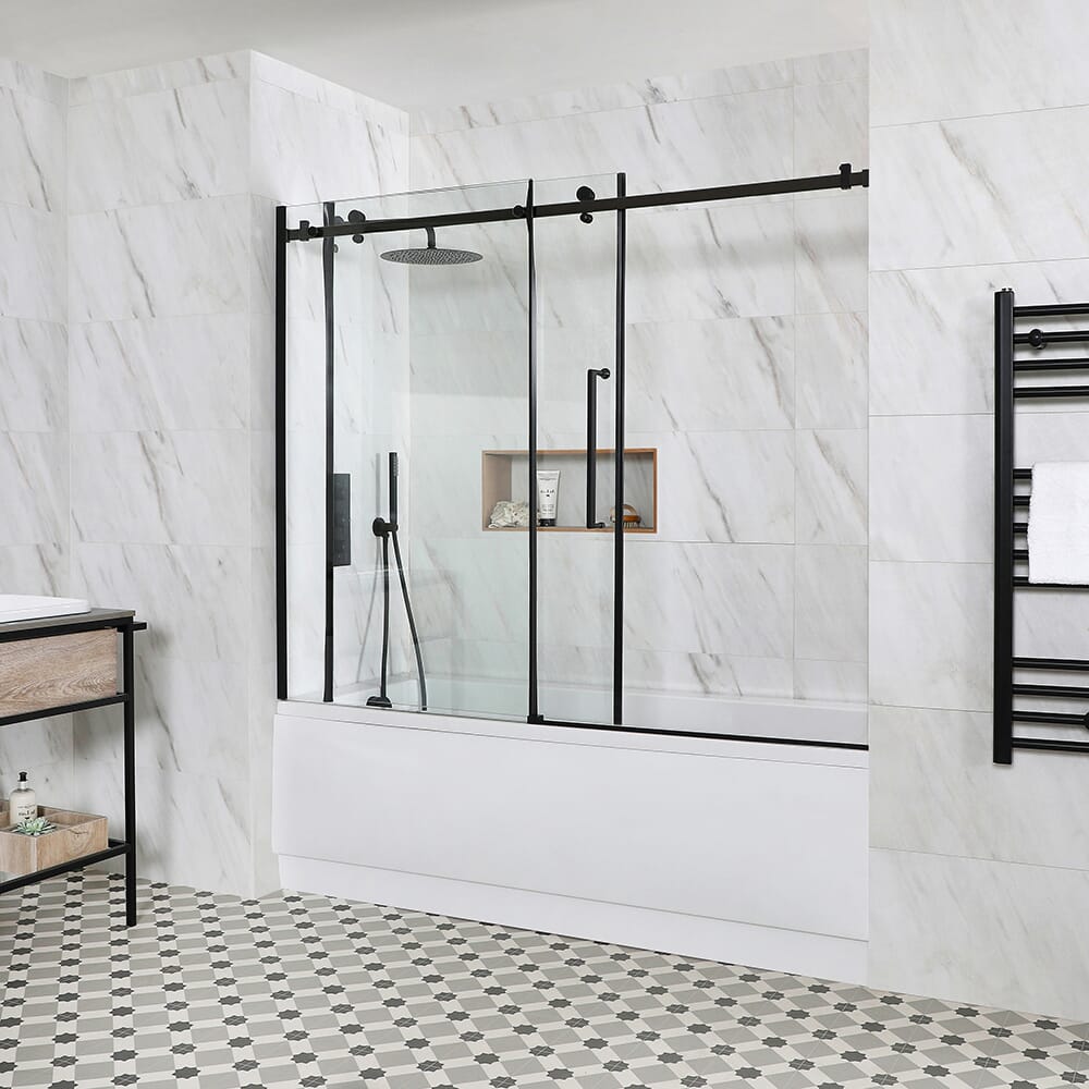 Crea un look audace e contemporaneo con la parete doccia Nox per vasche da bagno con design senza cornice.