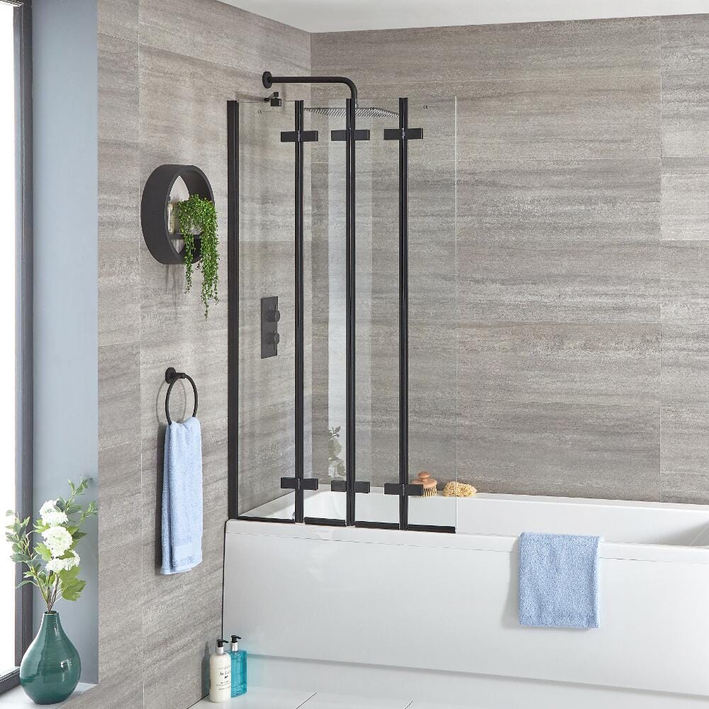 Questa elegante parete vasca pieghevole con profilo nero della gamma Nox fornisce la soluzione perfetta per aiutarti a proteggere il bagno dagli schizzi mentre fai la doccia.