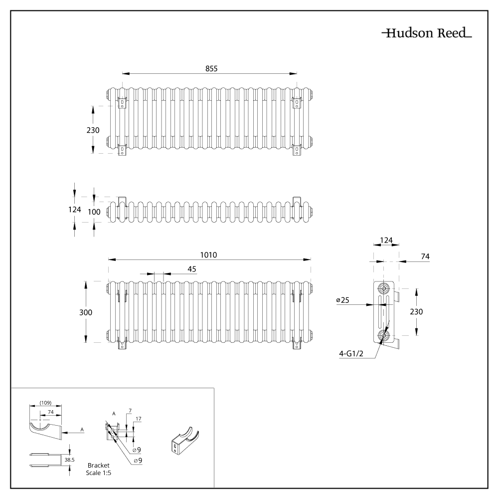 Radiatore a Colonna Tradizionale Orizzontale in Metallo Grezzo Laccato - 300 mm x 1010 mm (Tripla Colonna) - Regent