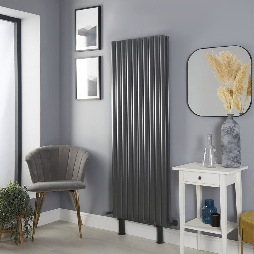 Il radiatore verticale di design Revive antracite, completo di piedini a pavimento, è il perfetto connubio tra stile e funzionalità.