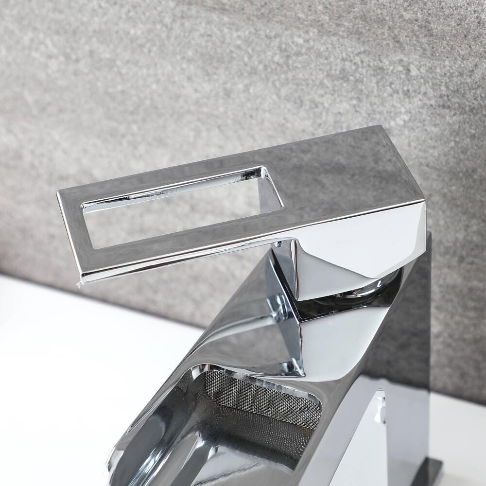 Realizzato in ottone massiccio per una durata garantita, questo rubinetto per lavabo presenta un erogatore aperto, che crea un rilassante effetto cascata e una finitura cromata resistente che si adatta a qualsiasi arredamento del bagno. La maniglia a leva singola fornisce un controllo senza sforzo del flusso e della temperatura, mentre la tecnologia del disco in ceramica previene perdite e gocciolamenti.