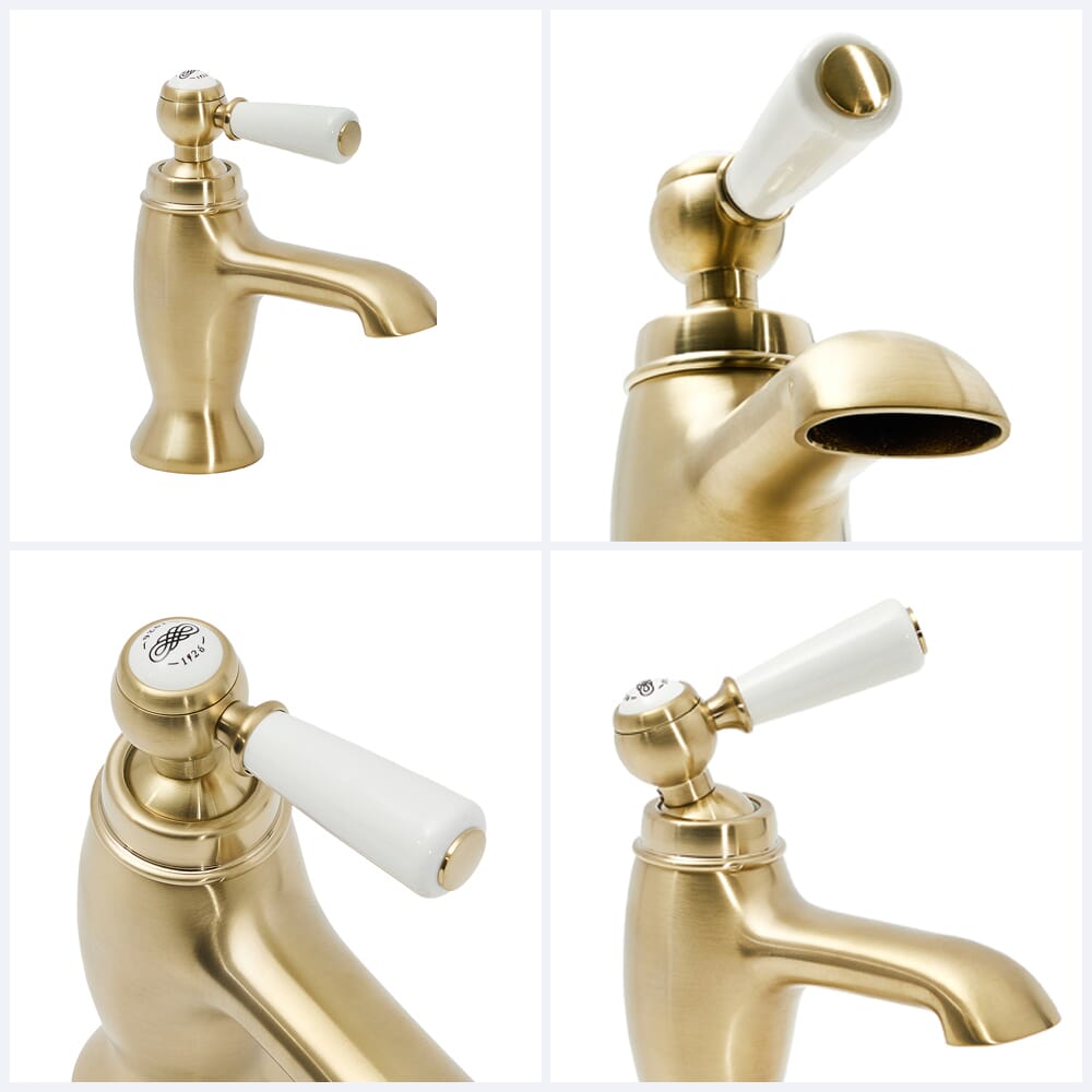 Realizzato in ottone massiccio, questo rubinetto mono lavabo presenta un design elegante e una resistente finitura in oro satinato, creando un look che resisterà alla prova del tempo.