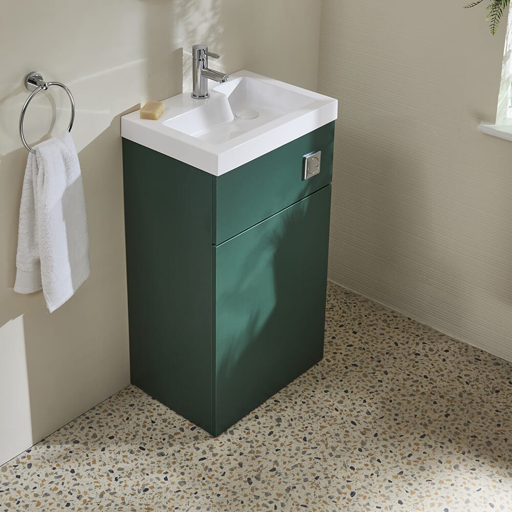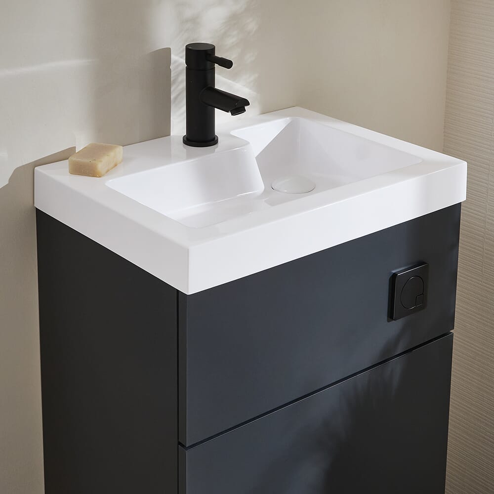Il set bagno completo di lavabo e WC della gamma Cluo, con cassetta a doppio scarico a risparmio idrico, offre una soluzione salvaspazio elegante e pratica anche per i bagni più piccoli.
