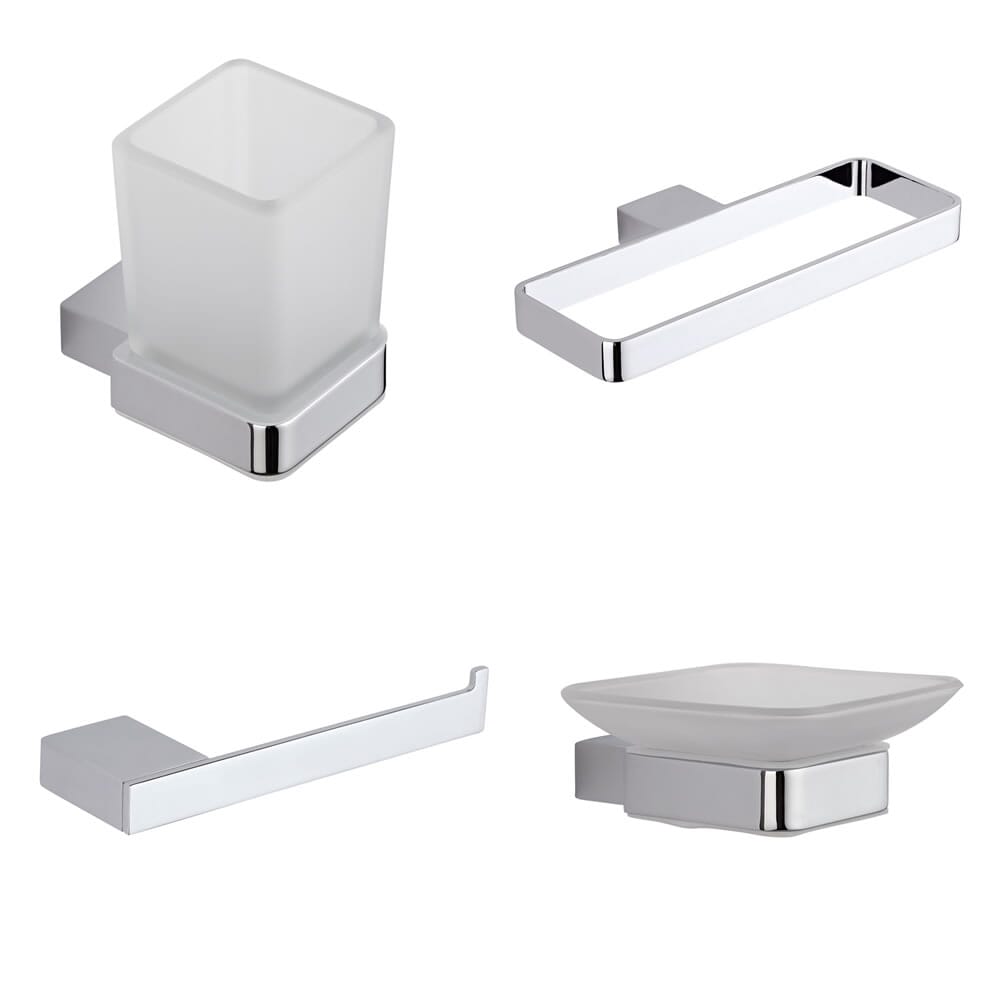Una lussuosa collezione caratterizzata da linee pulite che sarà perfetta per complementare qualsiasi stanza da bagno arredata in stile contemporaneo. Il set include un porta salviette murale rettangolare, un portasapone murale, bicchiere per spazzolini da denti e un porta rotolo carta igienica murale.